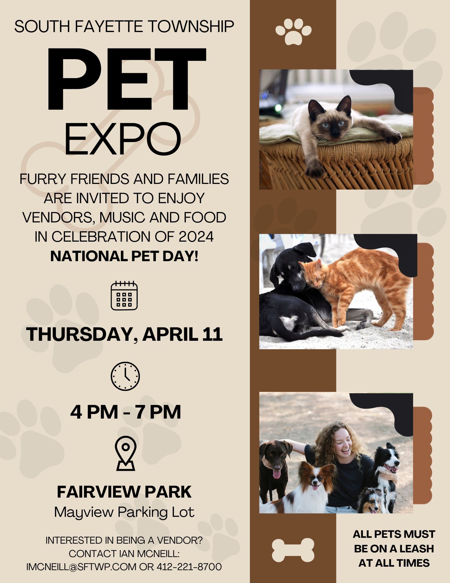 Do you have a pet-related business? Be a vendor at our Pet Expo on Thurs. April 11, 4 PM to 7 PM, at Fairview Park in South Fayette Township. Find details and register as a vendor on the South Fayette Parks and Recreation website, or call Ian McNeill at 412-221-8700, ext. 222.