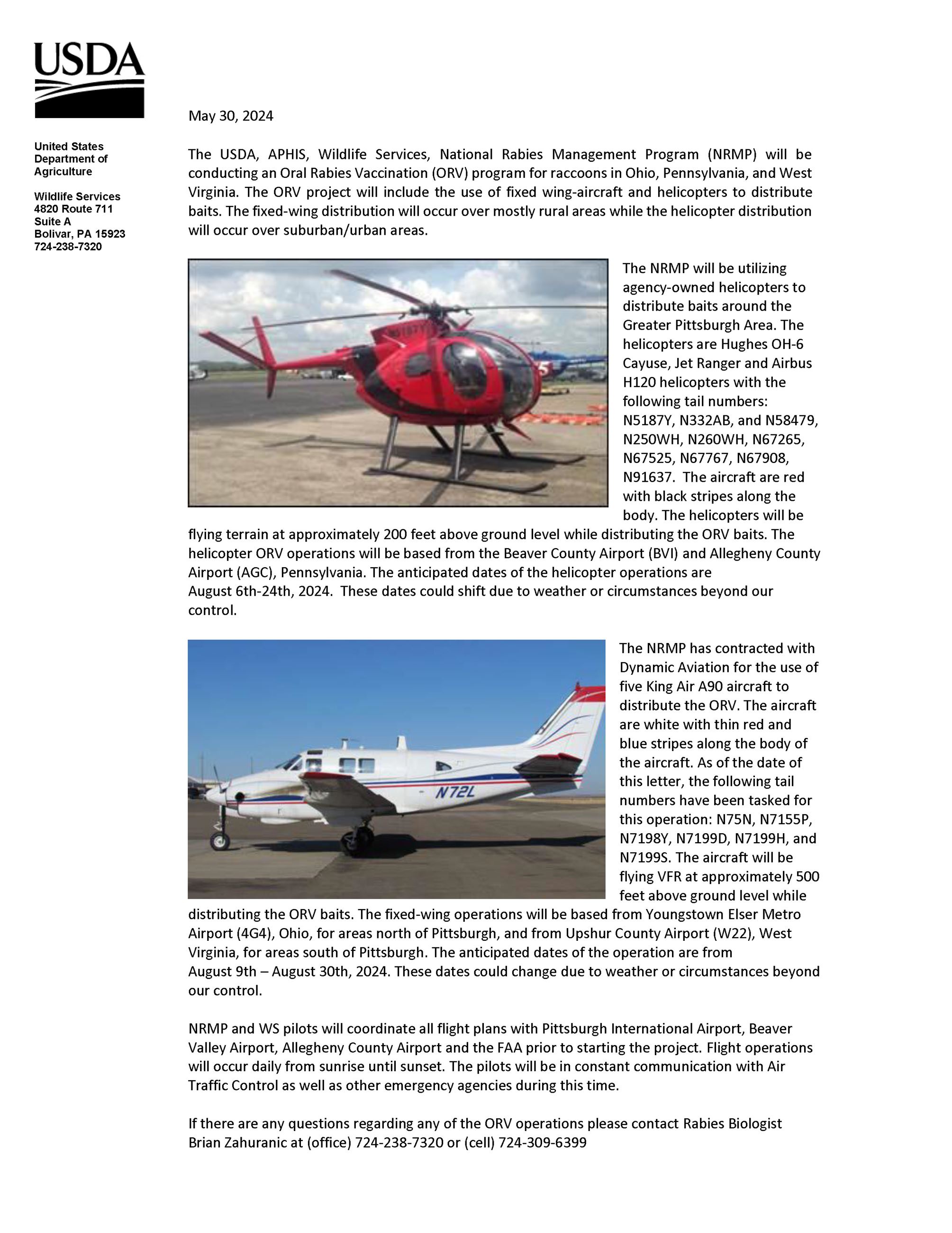The baits will be delivered by hand from ground vehicles (Aug. 5 - Aug. 9) and by aircraft, including helicopter and fixed-wing airplane (through Aug. 30). You may notice aircraft flying low over residential areas and, at times, moving slowly over the same area multiple times within a short period.